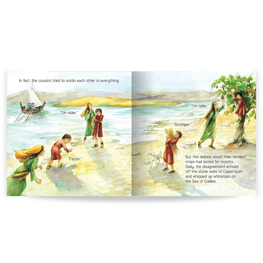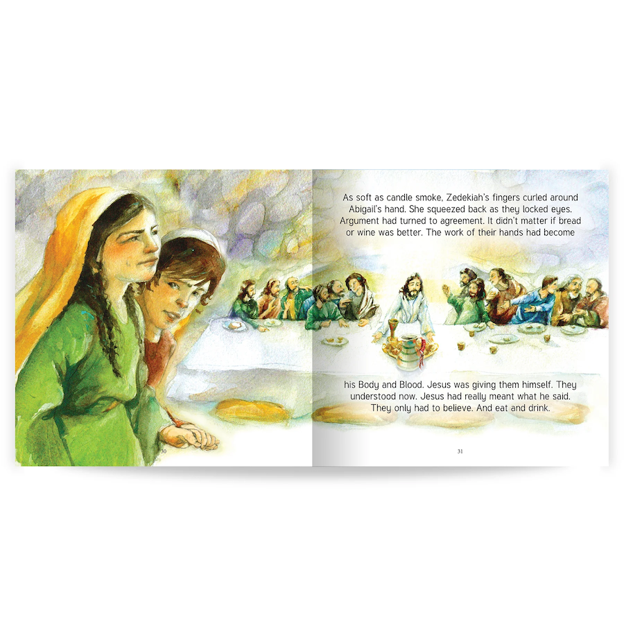 Zedekiah and Abigail, two young cousins living in Capernaum at the time of Jesus, argue about everything. They want Jesus to judge which of their families’ crops is better—grain or grapes? But when they find themselves in the Upper Room at the Last Supper with gifts of their harvests for Jesus, they discover something more important than their presents.